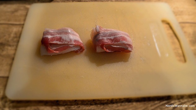 Dann teilt man den Skrei in zwei Teile, entfernt vorsichtig die Haut und wickelt ihn in Speck ein.