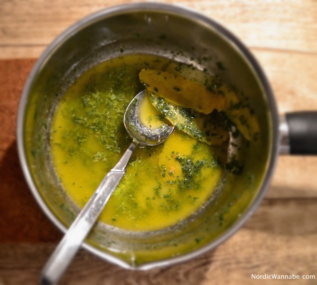 Die Butter in einem Topf zerlassen. Nicht zum Kochen bringen. Petersilie und Zitronenabrieb und Brot hinzufügen. – Da ich keine Reibe hatte, habe ich die Zitronenschale mit dem Sparschäler entnommen und komplett in die Butter gelegt. Nach kurzer Zeit habe ich die Schale dann wieder herausgenommen. Bitte nicht zu viel Zitrone nehmen, sonst wird die Butter zu bitter.