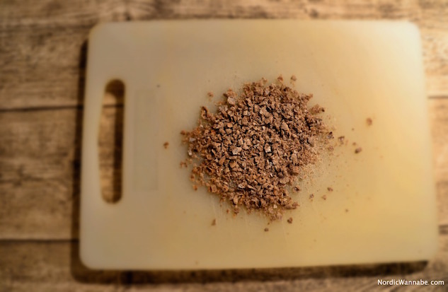 Das Knäckebrot habe ich zwischen zwei Schneidebretter gelegt und dann zerkleinert. Das hat wunderbar geklappt.