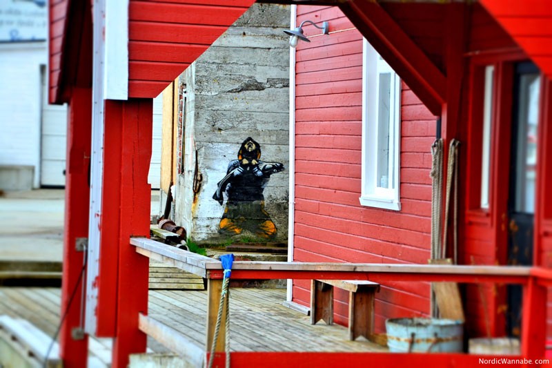 Hier blieben wir 30 Minuten, besuchten einen Kiosk, die anderen Geschäfte waren noch geschlossen und es gab einen Souvenir-Shop. Perfekt für Touristen, denn dort gibt es alles, was das Herz begehrt: selbst gemachte Lofoten-Schokolade, Postkarten, Plüschtiere, Marmelade und Co. Generell habe ich das Dorf als kreative Fundgrube empfunden. Es gibt viele kleine versteckte Kunstobjekte, Malereien, kreative Sprüche auf Schildern. Offensichtlich sind die Einwohner, zurecht, genervt von parkenden Touristen. Überall sieht man Schilder mit „no parking“. 🙂