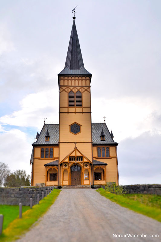 Ab und zu sah man am Straßenrand ein paar Zelte. Ist das nicht ein herrlicher Ausblick, wenn man sein Zelt öffnet und dann auf das Wasser schaut? In Kabelvåg, kurz vor Svolvær, sieht man die beeindruckende Lofotenkirche aus Holz: Vågan kirke. Sie wurde extra für die Lofotenfischer erbaut.