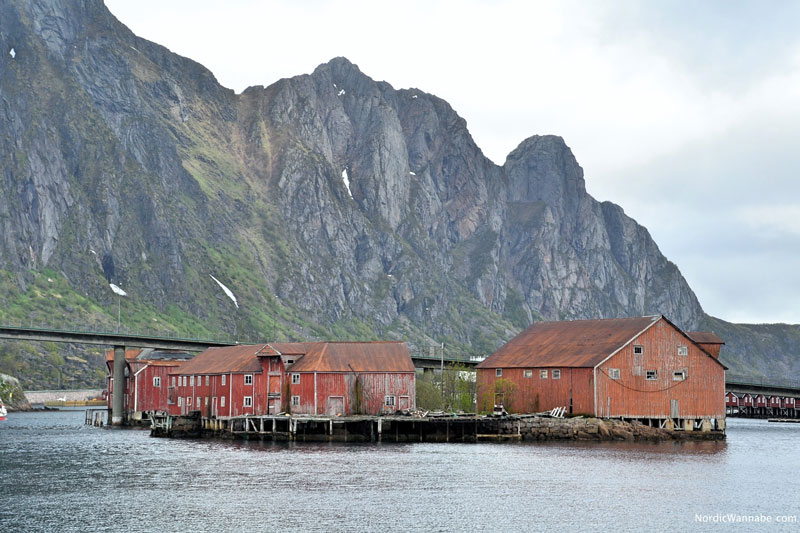 Stockfisch (tørrfisk oder torrfisk) wird paarweise an die Holzgestelle aufgehängt. Größtenteils ist es getrockneter Kabeljau (Dorsch). Typisch für die Lofoten. Dann kommt man in den kleinen Ort, wo um die 400 Menschen wohnen. Viele Häuser sind rot, aus Holz und stehen auf Holzpfählen.