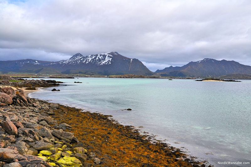 Zwischen Leknes und Reine, hinter Vareid, fanden wir dann diesen Sandstrand. Weißer Sand und türkises Wasser – sind wir wirklich noch in Norwegen? Dieser Anblick war so surreal. Es war kalt, hatte geregnet und zwischen den kahlen Bergen war diese Bucht. Sommer-Feeling. Wir nahmen uns die Zeit und stiegen aus, um Muscheln zu sammeln. Das Wasser war kalt, aber wir hatten ja eh keine Badesachen dabei. 🙂