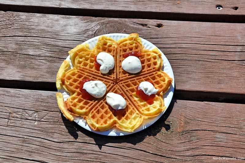 Die roten Häuser befinden sich auf einem kleinen Kai, den man entlang gehen kann. Dort gibt es ein gelbes Haus mit der Aufschrift „Molokroken“ und einem grünen Dach, wo es Kaffee und Waffeln gibt. Ein Insider-Tipp scheint es nicht zu sein, denn da war richtig viel los. Die leckeren Waffeln gibt es mit Marmelade und Rømme zu fairen Preisen. Wer einen Hund hat, bekommt kostenlose verkohlte Waffelstücke. 🙂