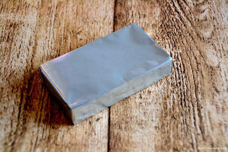 Die Schokolade ist in Alufolie eingewickelt und pro Packung gibt es 10 Scheiben. 45 Gramm pro Packung und 100 Gramm haben 525 Kalorien. Die Verpackung sieht retro aus und es gibt eine kleine Anleitung, wie man Pålæg-Schokolade richtig nutzt. – Made in Dänemark. 🙂