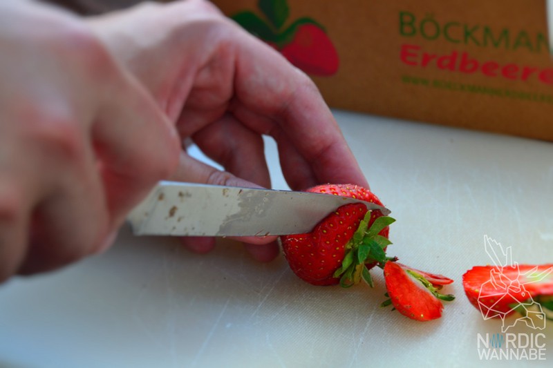 Am Anfang war die Erdbeere, die sehr populär in Schweden ist – wie bei uns. Für die Marmelade habe ich einen Kilogramm frische Früchte direkt vom Feld gekauft. Ich bilde mir ein, dass die besser schmecken als aus dem Supermarkt. Was meint Ihr? Diese mussten schnell verarbeitet werden, weil es warm war und die Beeren dann empfindlicher sind und Druckstellen bekommen.