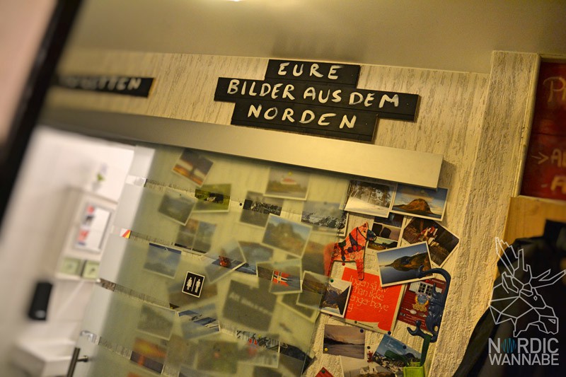 Und auch der Rest kann sich sehen lassen. Die kleine Bar im Eingangsbereich ist sehr einladend. Auf dem Weg zu den Örtlichkeiten, kann man Grüße aus dem Norden sehen, die dort an einer Wand gesammelt werden. Und sehr schlicht, aber effektiv sind die kleinen Birkenstämme, die als Teelichthalter dienen. Man merkt, dass die Besitzerin sich viel Gedanken über alle Details gemacht hat. Es gibt sogar einen Gulli-Deckel aus Tromsø, Norwegen. 🙂