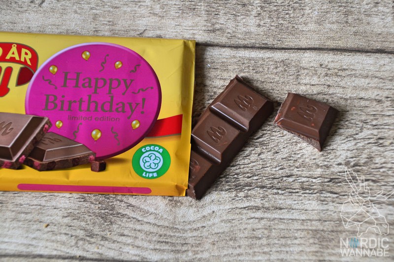 Marabou feiert in diesem Jahr 100 Jahre Jubiläum. Passend zum Geburtstag gibt es eine Geburtstagsediton mit Himbeerschokolade. Himbeer scheint der neue Trend zu sein in Schweden. 🙂 In der Verpackung, in gelb, sind 185 Gramm Milchschoklade mit Himbeer Fudge. Ich bin ja wirklcih ein großer Fan von MArabou aber diese Sorte schmeckt mir nicht ganz so gut. Ich habe nur ein paar Stückchen probiert. Dabei finde ich Himbeeren eigentlich ganz cool und esse sie auch gerne. Aber bei dieser Schokolade hoffe ich, dass sie auf ein Jahr limitiert ist und dann wieder was leckeres kommt. 536 Kilokalorien gibt es pro 100 Gramm.