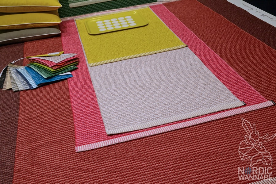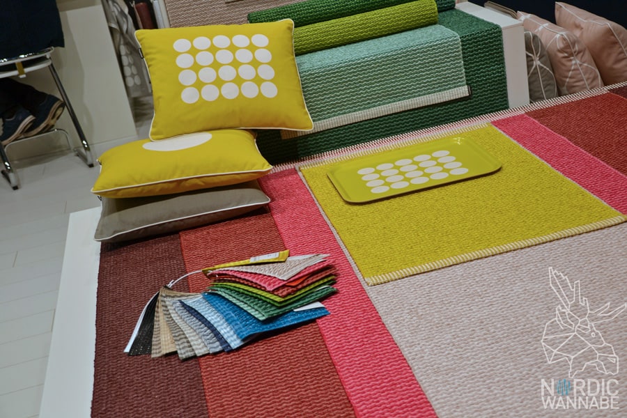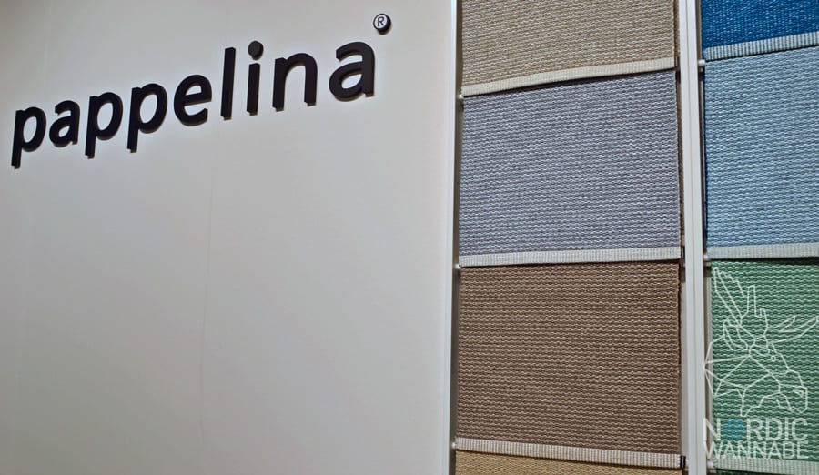 Ebenso neu für mich war die Marke Pappelina auf der Ambiente in Frankfurt. Pappelina steht für Teppiche, Kissen, Decken, Geschirrtücher, Tabletts, Tischläufer und die Idee dazu wurde von Lina in ihrer Heimatstadt Falun ins Leben gerufen. Darauf machte sie eine Weberausbildung in Göteborg und baute Ihren bisherigen Erfolg dank einer Weberei in Dalarna weiter aus. Dort entdeckte sie auch die Plastikbänder, die typisch sind für die gewebten PVC-Teppiche. Heute werden circa 100 000 Läufer jährlich produziert und 40 Personen in Dalarna beschäftigt.