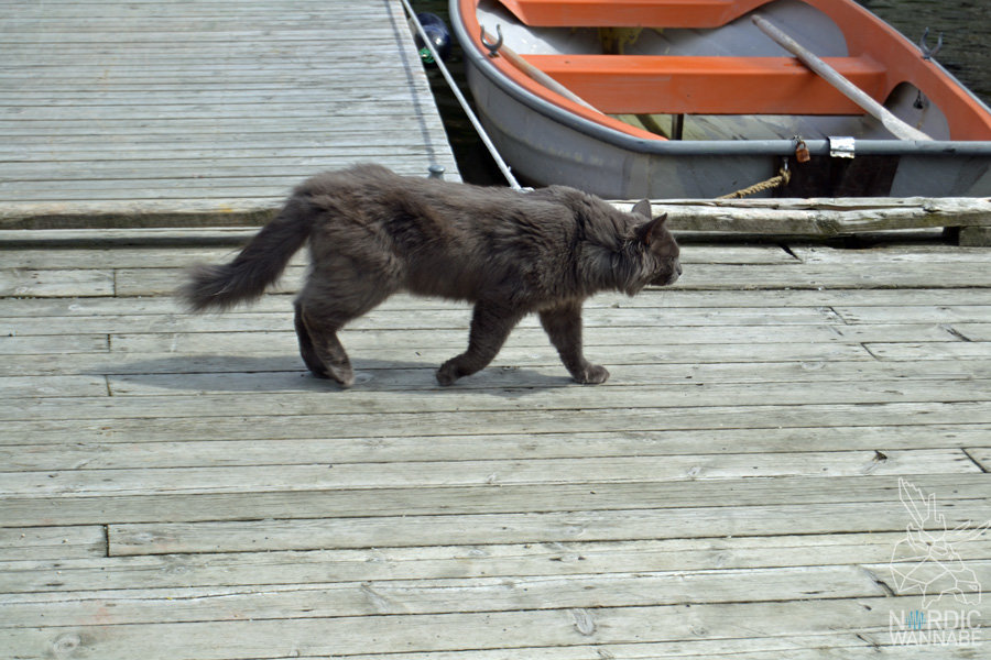 sich vorstellt. Gelber Sand und perfekt für das Sommerwetter. Leider hatte ich nicht mehr so viel Zeit und musste mit der nächsten Fähre wieder zurück zum Festland. Doch bevor ich wieder auf das Schiff ging, machte ich noch einen Abstecher in den Supermarkt. Davor lag eine dicke Katze und sonnte Ihr Fell. Hier in dem kleinen Supermarkt, okay in Deutschland wäre es eher ein Kiosk, gibt es aber alles, was man so braucht. Wenn man aus dem Supermarkt schaut, fällt der Blick direkt auf das rote Holzhaus Sjøhuset. Hier kann man auch übernachten. Wenn ich es richtig verstanden ist, ist es ein Hostel, was bei Kindergruppen sehr beliebt ist.