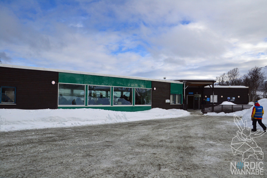 Bei den Kreuzfahrten ist es oft so, dass man sich an bestimmten Orten auf dem Schiff trifft, wenn man einen Ausflug gebaucht hat. So war es dieses Mal das Theater. Man gibt dann sein Buchungsdokument ab, bekommt einen Aufkleber oder so und geht dann als Gruppe zum Bus. Das sind eigentlich die Momente, die ich anstrengend finde bei Kreuzfahrten. Viele Menschen auf einem Haufen und immer diese Kreuzfahrer, die alles besser wissen, obwohl sie noch nie zuvor in Norwegen waren. Aber das gehört wohl dazu. – Wir hatten eine tolle Reiseleiterin. Aa achtet AIDA anscheinend wirklich darauf, dass die örtliche Agentur nettes und kompetentes Personal stellt. Wir hatten eine junge Reiseleiterin, die viel zu erzählen hatte und so verging die Zeit zur Farm (etwa 45 Minuten) wie im Fluge. Wir fuhren aus Tromsø heraus, vorbei an vielen Bergen bis wir in ein Gebiet kamen, wo viel Schnee lag. Der Himmel war blau, die Luft war klar und die Berge waren weiß. Hier kann man übrigens auch gut Nordlichter sehen.