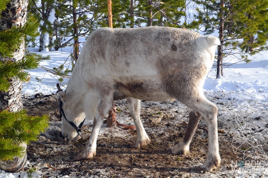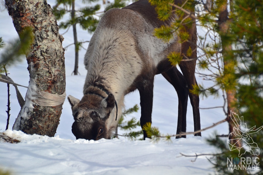 Wir gingen zurück zur Gruppe, denn mittlerweile waren noch mehr Busse mit Menschen angekommen. Es wurde immer voller. Zufällig entdeckten wir dann hinter einem kleinen Schneehügel ein paar Rentiere. Und das war so toll. Die Gruppe war schon weitergezogen und so hatten wir die Aufmerksamkeit der Tiere für uns ganz allein. Ich hatte ein Rentiere schon mal am Nordkap gesehen, aber das war total touristisch und voll. Nun konnte ich den Tieren mit einem respektvollen Abstand nahkommen und Fotos machen. Schon allein deswegen hatte sich der Ausflug gelohnt. Einfach toll und unvergesslich. Rentiere haben so treue und liebe Augen. Und sie strahlen irgendwie Frieden aus.