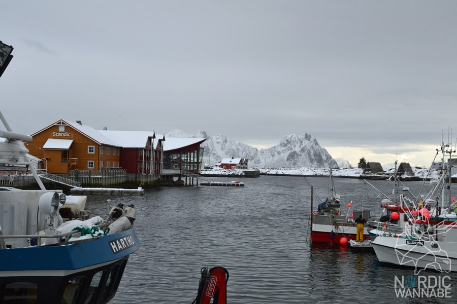 Knapp drei Stunden dauerte die Fahrt von Sortland zum ersten Ziel: Svolvær. Wie immer in Norwegen, war schon der Weg das Ziel. Wir fuhren an vereisten Seen, verschneiten Bergen und vielen roten Holzhäusern vorbei. Der erste Abschnitt der Straße war nicht geräumt und deswegen fuhren wir sehr vorsichtig und langsamer als erlaubt. Die Norweger überholten uns die ganze Zeit. Aber das ist ganz gut – die kennen sich schließlich aus und sind vertraut mit der Witterung. Solltet Ihr mal im Winter mit dem Auto in Norwegen unterwegs sein, lasst ruhig die erfahrenen Norweger vorbei. Denn sonst fühlt man sich gestresst. Lieber rechts ranfahren und dann weiter. Dann kann man auch mehr von der Landschaft sehen. Aber Vorsicht: Unterwegs haben wir immer wieder Touristen gesehen, die über den Mittelstreifen fuhren, weil sie zu abgelenkt waren. Das sollte nicht passieren! Aber zurück zur wunderschönen Stadt Svolvær. Ich glaube, sie ist die Hauptstadt der Lofoten. Es roch an diesem Tag sehr streng nach Skrei, dem norwegischen Winterkabeljau. So richtig heftig. Am Hafen ist es am schönsten, wie ich finde – egal ob Winter oder Sommer. Dort liegen kleine Fischerbote, die Gestelle für Stockfisch und hier ist auch ein tolles Scandic Hotel in dem ich irgendwann mal übernachten möchte. Dahinter ist ein großer Berg, der mit Schnee bedeckt war.