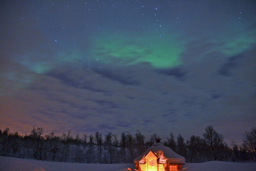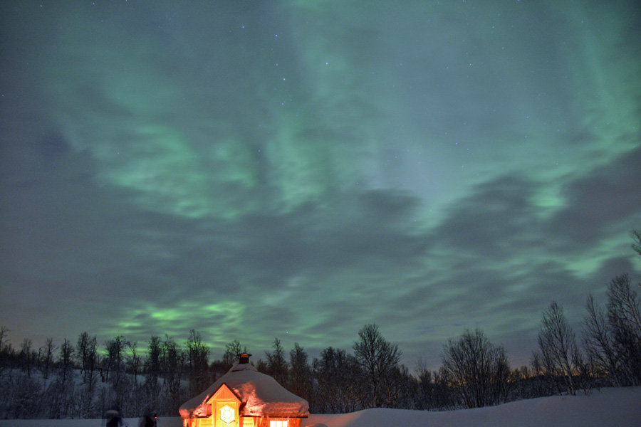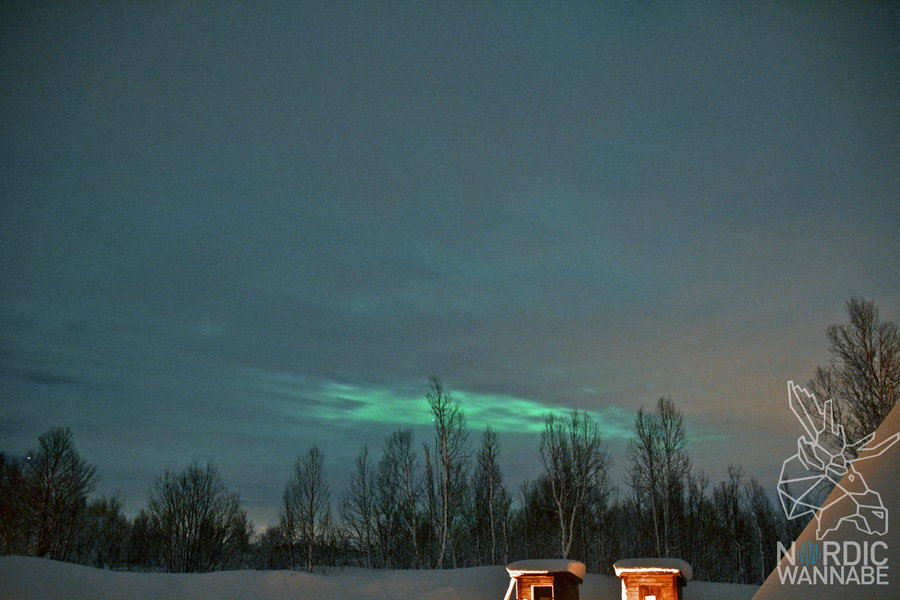 Ich kannte Nordlichter bisher immer nur von Fotos und Videos. Doch in Realität sehen die ganz anders aus. Ich habe die erst gar nicht erkannt, weil es wolkig war. Aber auch so sind die Nordlichter anscheinend eher grau als grün oder rot. Ich weiß nicht, ob das nur bei uns so war oder immer. Woran liegt das? Das menschliche Auge kann nicht die Farben so aufnehmen, wie beispielsweise die Linse einer Kamera. Eine Linse ist viel empfindlicher als das Auge. Das ist natürlich etwas enttäuschend, wenn man vorher nur die Nordlichter aus Filmen kennt. Die Filme sind übrigens auch nur einzelne Bilder, die aneinander geschnitten wurden. Sobald man aber das fertige Foto auf dem Display sieht, ist man verzaubert. Denn auf dem Display sind die Nordlichter farbig. Hier auf dem Foto seht Ihr die Nordlichter, wie ich sie mit dem Auge gesehen habe.