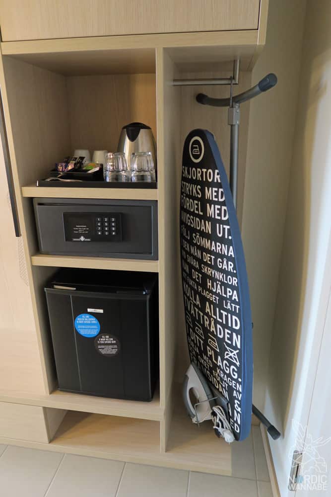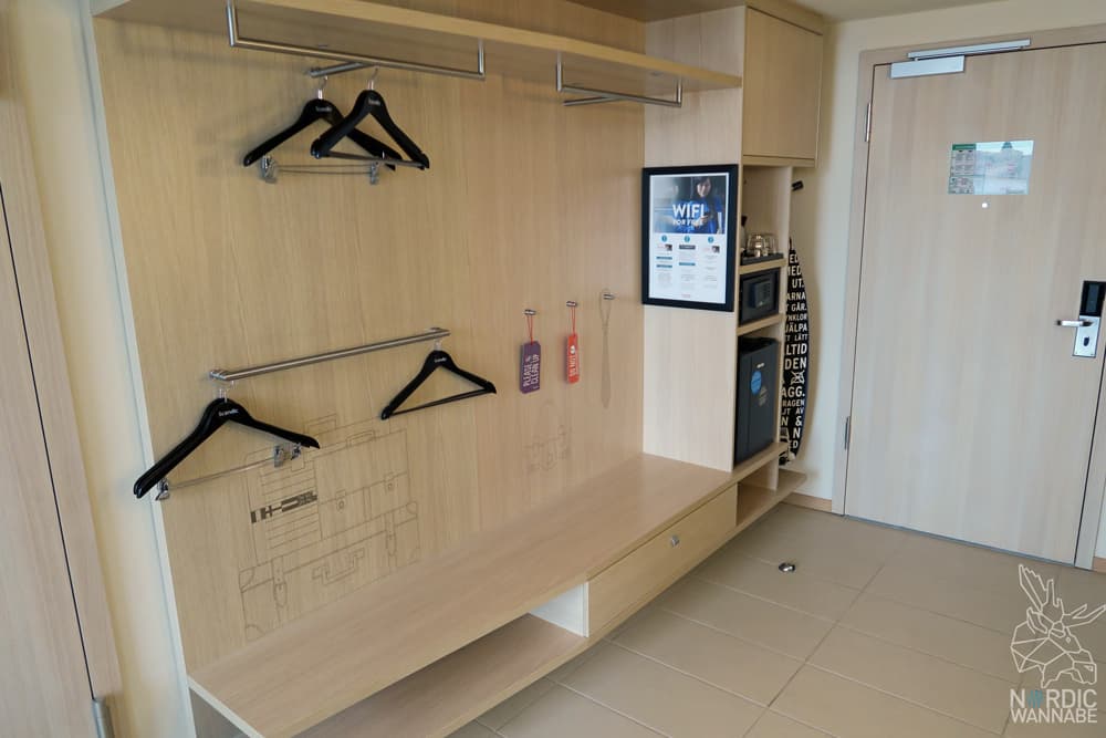 Ich glaube, dass das Zimmer ein Superior-Zimmer war. Deswegen gab es zum Beispiel eine kostenlose Mini-Bar und eine Senseo-Kaffeemaschie. Aber auch bei einem normalen Zimmer habt Ihr eine Flasche Wasser kostenlos inklusive sowie ein Kingsize-Bett. Bei mir waren die Betten verstellbar in der Höhe, aber drauf gehe ich hier nicht ein, weil ich nicht glaube, dass das Standard ist. Es gab außerdem einen Wasserkocher für Tee/Kaffee und ein Bügelbrett mit Bügeleisen. Neben dem Bett stand eine Musikbox von Sonoro. Aber die habe ich nicht ausprobiert. Wie war das Zimmer? Super! Kostenloses WLAN, richtig gut sauber und viel Platz. Das Design des Zimmers ist sehr ansprechend. Kein Teppich, was ich einfach mag in Hotels! Das Holz ist schön hell und zieht sich von der Garderobe über den Schreibtisch bis zum Bett.