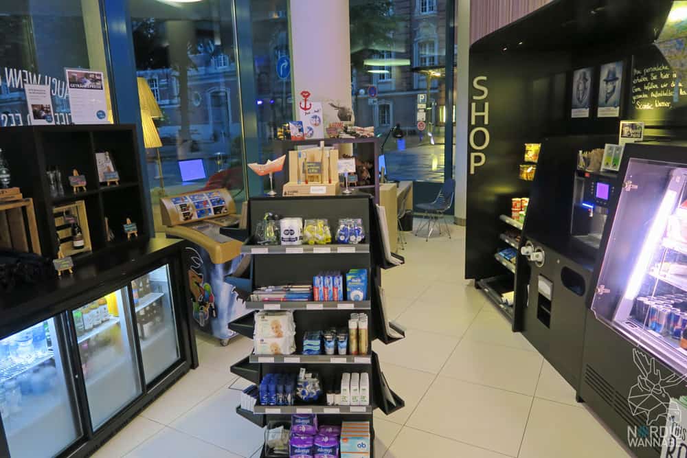 Das Thema im Scandic Hotel Emporio Hamburg ist scheinbar Wasser. Das Restaurant inklusive Bar heißt H2O. „Wasser ist Leben“ stand in meinem Zimmer an der Wand. Und dann der Fahrstuhl. Der ist so cool. Das Licht im Fahrstuhl ist blau und je nach Höhe ändert sich die blaue Farbe. Das ist wie beim Tauchen und ertönt entspannte Musik. Die Lobby ist auch wunderschön – typisch skandinavisch – schön schlicht und stilvoll. Dort findet Ihr auch Rechner mit Internetanschluss, falls Ihr selbst keinen Computer dabei habt und es gibt einen kleinen Kiosk, wo man die nötigsten Dinge inklusive Süßigkeiten und Elche bekommt. Zu den Zimmerpreisen kann ich Euch nichts sagen, weil die immer variieren nach Verfügbarkeit. Schaut am besten mal auf der Webseite vorbei. Da gibt es schon Zimmer ab 127,00 Euro.