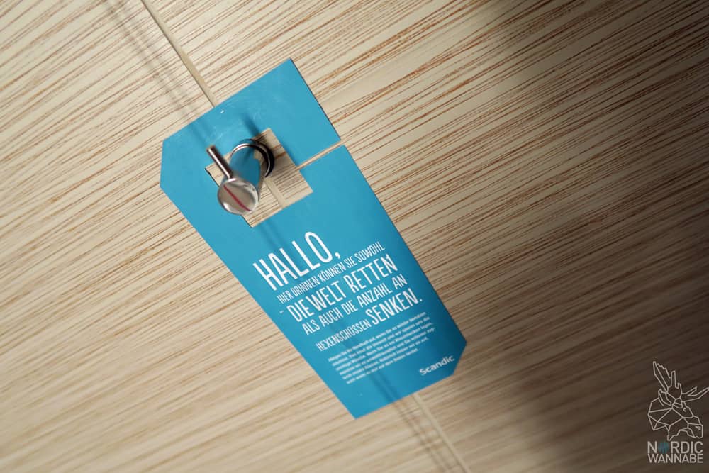 Das Bett ist sehr bequem und auch die Kissen und Decken machen einen ordentlichen Eindruck. Was ich sehr wichtig finde, sind Steckdosen neben dem Bett. Denn ich brauche immer Steckdosen, um mein Handy nachts aufzuladen. Und weil das Smartphone auch mein Wecker ist, bringt es nichts, wenn die Steckdose ganz weit ist. Hier im Scandic gibt es die Steckdosen am Bett – super! Stauraum für Wäsche und Koffer gibt es auch. Am Schreibtisch kann man die wichtigsten Büro-Aufgaben erledigen und den Müll trennen. Der Boden ist übrigens aus Echtholz, es gibt einen LED-Fernseher und einen Safe. Ach, das Hotel ist einfach super. Zur Begrüßung bekam ich ein kleines Anschreiben: