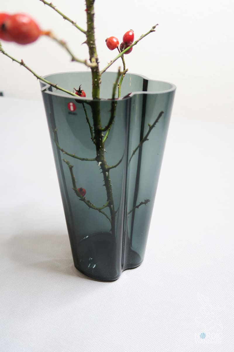 Für das Shooting wurden mir zwei Vasen leihweise zur Verfügung gestellt und es fiel mir nicht leicht diese wieder zurückzuschicken. Diese Vasen sind einfach der Inbegriff für skandinavisches Design. Alvar Aalto, wohl einer der bekanntesten nordischen Designer neben Arne Jacobsen, entwarf das Design der Vasen im Jahr 1936. 1937 wurde das Luxusrestaurant Savoy in Helsinki eröffnet und seither tragen die Vasen den namen Savoy-Vasen. Aktuell zählen zur Alvar Aalto Kollektion Schalen, Leuchtern und Vasen in unterschiedlichen Glasfarben.