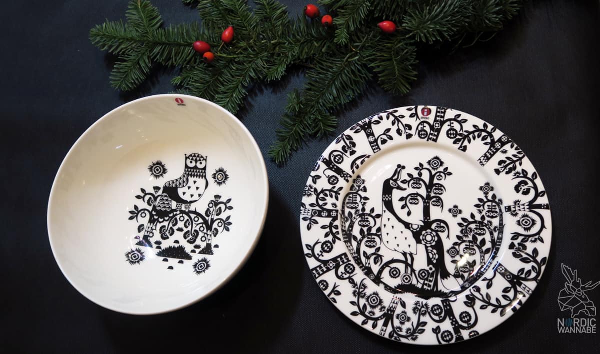 Schwarz-weiß ist ein Trend aus Skandinavien und geht immer. Nichts ist neutraler als diese Kombination. Sie passt zu jedem Tisch, zu jeder Tischdecke und zu jedem Anlass. Für meine black-white-Kombi habe ich mich für die flachen Taika Teller (22 cm) für knapp 27 Euro entschieden. Das Design stammt vom finnischen Designer Klaus Haapaniemi. In der Mitte des Tellers finden wir ein Fabelwesen und am Tellerrand einen Wald. Die Taika-Serie ist sehr umfangreich und bietet alles, was man für den Tisch so braucht. Zum Beispiel auch die schöne Schüssel mit einem Eulen-Wesen. Darüberhinaus findet Ihr aber auch Tassen, Untertassen und Kännchen. Dieser Stil ist ohne Frage schlicht, zeitlos und passt zum Scandi-Style.