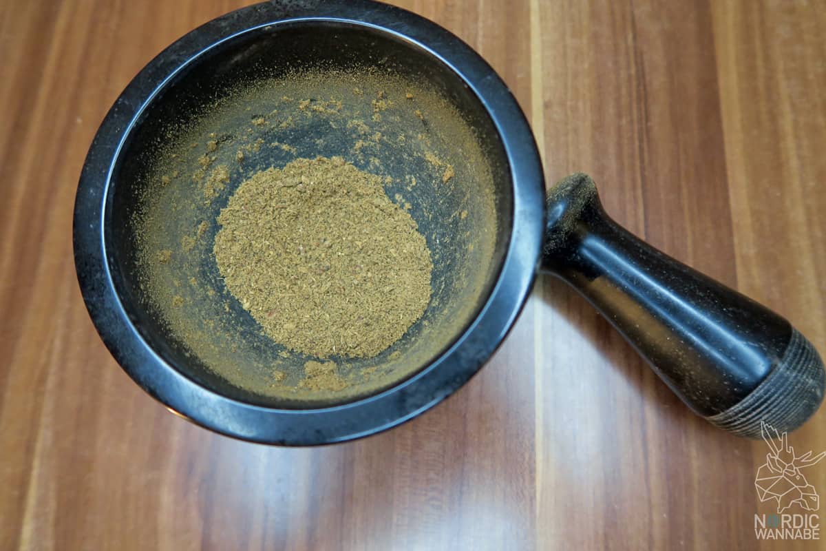 Jetzt kommt es darauf an, ob Ihr fertig gemahlene Gewürze nehmt oder sie selbst im Mörser zerkleinert. Denn am Ende müssen die Gewürze gemahlen sein.
