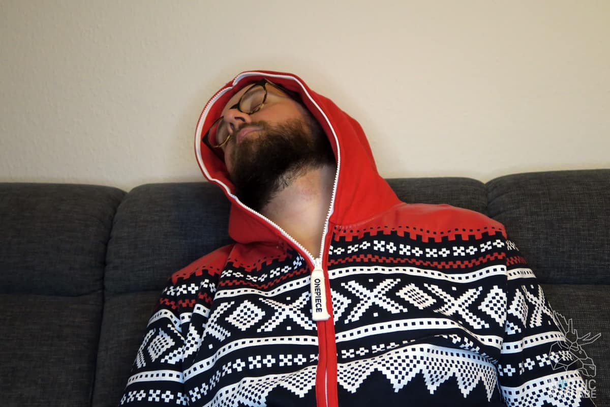 Der Jumpsuit von Onepiece kommt in einer Plastikverpackung und einer Tragetasche. Sehr praktisch, wenn man den darin wieder verpacken möchte. Beim Auspacken bemerkt man schnell, wie weich sich der Anzug anfühlt. Ich musste sofort reinschlüpfen, das Innenfutter ist wunderbar geschmeidig. Insgesamt besteht der Anzug aus 80 Prozent Baumwolle und 20 Prozent Polyester. Der Gummidruck ist hochwertig, was sehr wichtig ist. Denn es gibt nichts Schlimmeres als Aufdrucke, die mit der Zeit abgehen oder so „verwaschen“ aussehen. Vorne am Bauch gibt es zwei Taschen für die Hände. An den Seiten gibt es zwei Taschen mit Reißverschluss und oben gibt es eine Kapuze. Der Reißverschluss, den man von beiden Enden her öffnen kann, geht vom Schritt bis zur Kapuze. Einige hatte auf Instagram gefragt, ob man damit zur Toilette kann. Natürlich. Obwohl es für Männer natürlich leichter ist. 🙂 2007 wurde Onepiece übrigens in Oslo, Norwegen, gegründet.