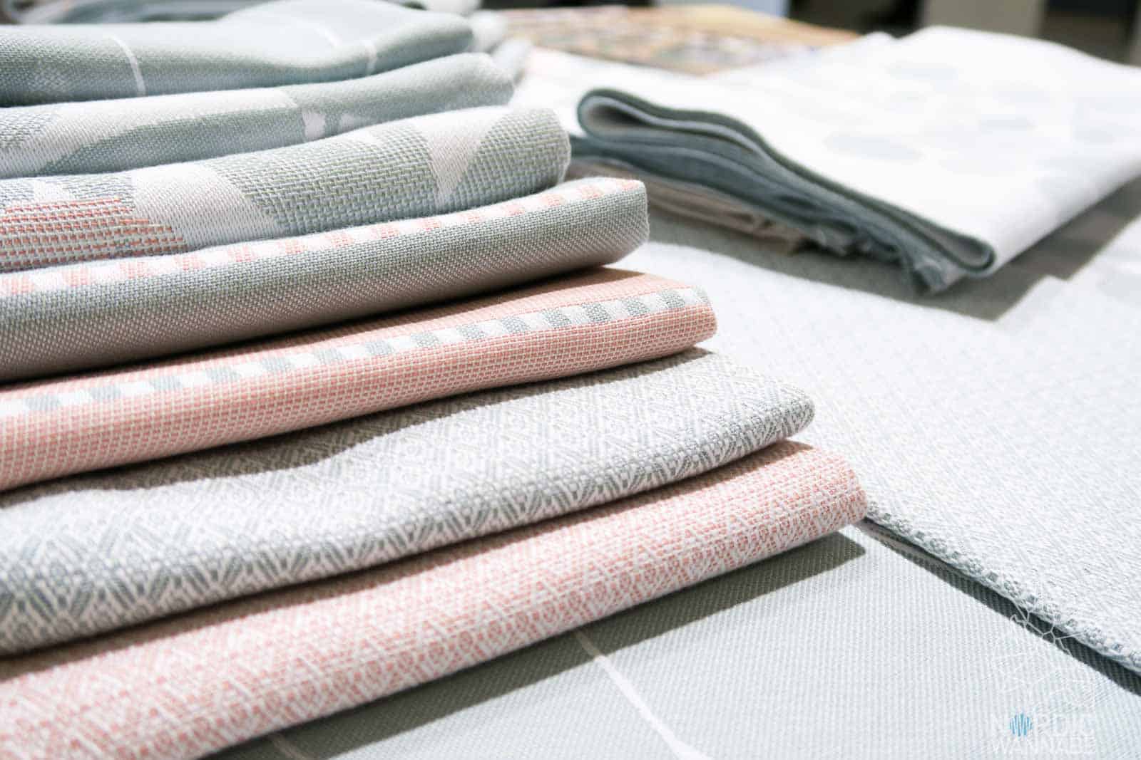 Es gibt vier Bereiche: Die Country House-Kollektion mit hellen Pastellfarben. Doch mir persönlich gefällt die Country House Collection (Scandinavian Version) noch viel mehr. Das Design erinnert mich total an Island, an raue Natur- einfach ein Traum. Dazu gehört zum Beispiel die graue Decke. Bei Boat House ist es maritim und da mag ich das Geschirrtuch mit den Walen. (Hab ich leider nicht fotografiert). Bei „Green House“ ist alles grün/gelb in der Farbwelt mit Vögeln, Insekten und Blättern. „Calm House“ überzeugt mit symmetrischen Mustern in grau, beige und rostbraun. Toll! Ich weiß nicht, wie es Euch ergeht? Aber mich sprechen die Designs sofort an. 🙂
