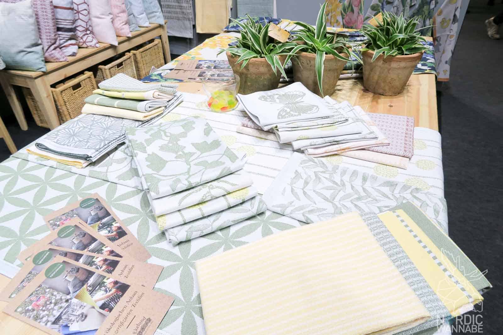 Es gibt wohl keine besseren Beispiele aus Schweden, die bisher sehr traditionell aufgestellt waren und nun moderne Produkte auf der Ambiente präsentierten, wie Kosta Boda und Ekelund. Fangen wir mit Ekelund an. Die Textilien werden in Schweden hergestellt, oft waren es Blumen und Obstmuster auf den Handtüchern. Das Material wirkte schwer, etwas altmodisch und die Farben waren dunkel, bunt und grell. Nun zeigte Ekelund eine neue Trend-Kollektion, die mich sofort verzaubert hat. Die Designs sind so unglaublich schön. Schaut mal: