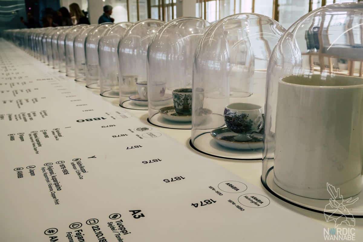 Es ging alles so schnell, ich fotografierte, filmte und verlor meine Gruppe. Aber alles gut, dann ging es nach oben, wo gerade ein Künstler seine Ausstellung vorbereitete. Denn die Helsinki Design Week stand vor der Tür und die letzten Kunstwerke mussten noch hergerichtet werden. Danach gingen wir in einem Raum, wo ein langer Tisch stand. Darauf befanden sich auf einem Zeitstrahl viele Design-Ikonen aus dem Hause iittala und Arabia. Auch ein Blick in die Vitrinen lohnte sich. Denn hier waren viele Schätze aus der Vergangenheit.