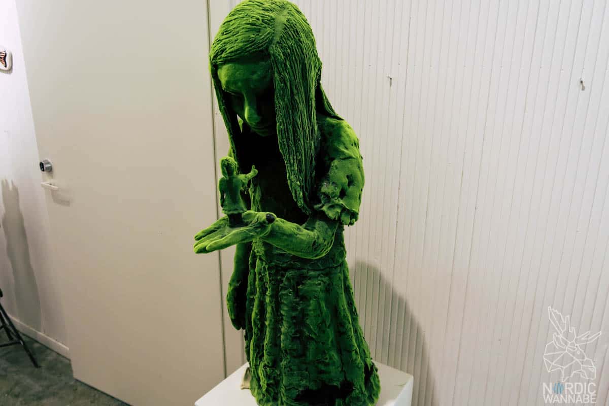 Wir durften dann noch einen Blick in Bereiche werfen, wo die Künstler kreativ sind und Ihre Werkstätten haben mit einem Ausblick über Helsinki. Es sprühte vor Kreativität dort und viele Künstler stellten Ihre Werke in einem langen Flur aus. Zum Beispiel dieses grüne Mädchen.