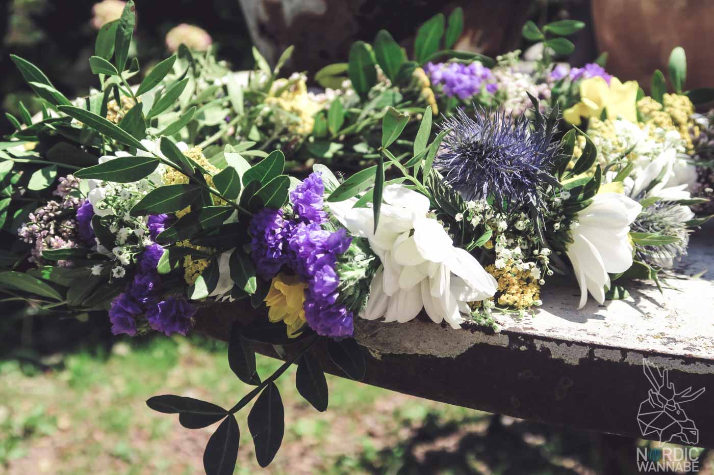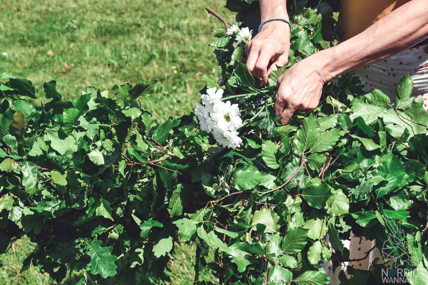 Wenn ich an Mittsommer denke, denke ich sofort an die selbst gebundenen Blumenkränze und natürlich den Mittsommerbaum. Deshalb gehören Wildblumen unbedingt zur Mittsommer-Dekoration auf Eurem Tisch und in Eurer Wohnung. Viele Blumengeschäfte bieten mittlerweile auch schon schöne, bunte Wildblumensträuße an. Auf dem Wochenmarkt habe mir dort einen schönen Strauss binden lassen. Ich habe nur gesagt: „Er sollte selbst gepflückt aussehen.“ Und der Strauß ist so schön geworden. Wenn Du begabt bist, kannst Du auch einzelne Blumen kaufen oder sogar selbst welche pflücken und dann einen Strauß zusammenstellen. Die Blumen kommen dann in kleine Vasen oder einfach so auf den Tisch. Viele Wildblumen sind eine gute Alternative zum Blumenkranz, den Du Dir natürlich auch selbst binden kannst. Dafür brauchst Du Draht, Blumen und viel Grün als Basis.