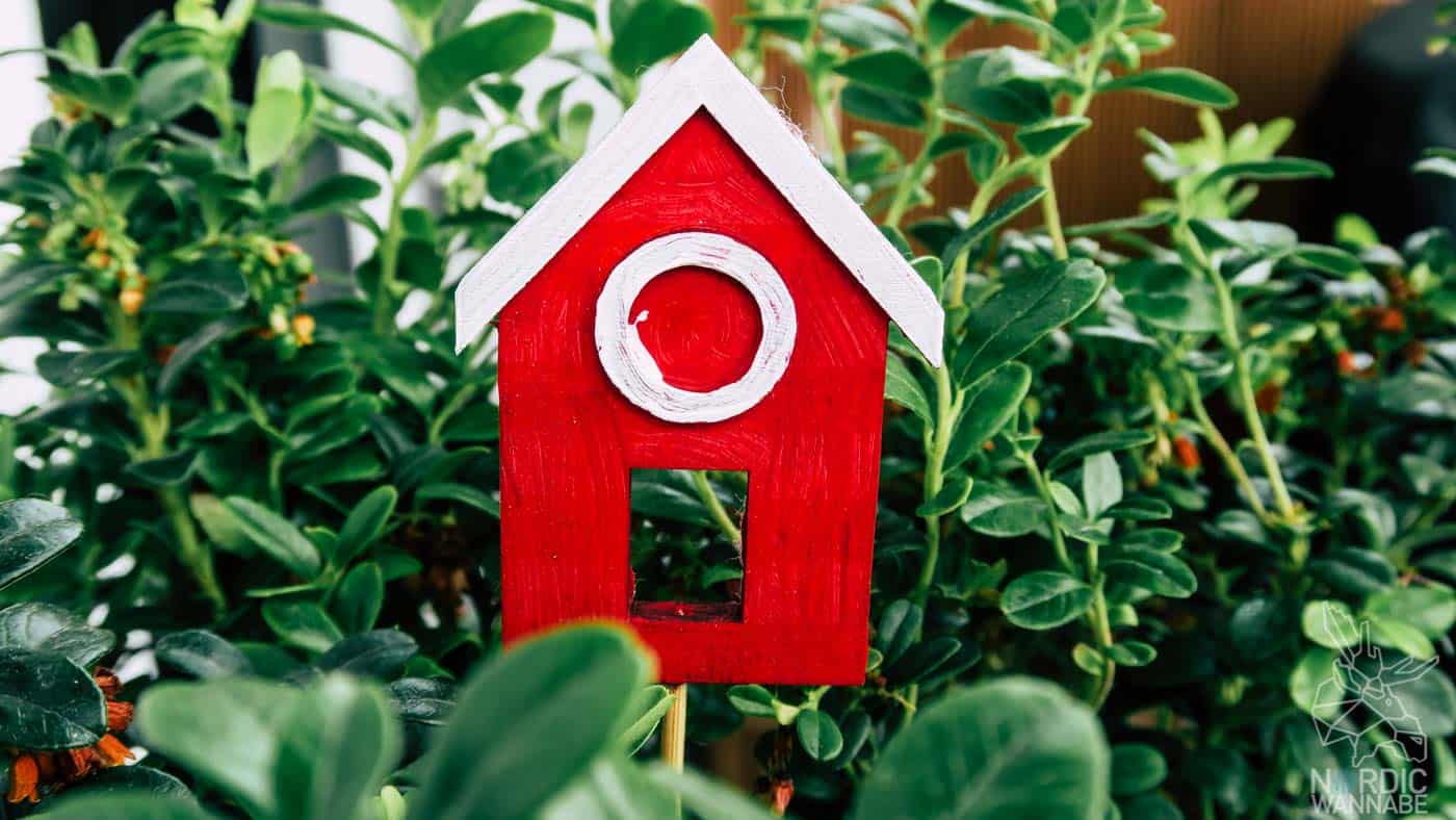 Natürlich verdienen auch unsere Balkonkästen einen Skandi-Look. Ich habe mal meine DIY-Fähigkeiten ausprobiert und mir im Blumenladen drei kleine Holzhäuser an einem kleinen Holzstab gekauft. Die Form gefiel mir, aber die Farben haben mich nicht so angesprochen. Deshalb habe ich mir dann im Baumarkt einen kleinen Pinsel und die Farben Rot und Weiß besorgt und mir aus den kleinen Häusern dann Schwedenhäuser gemacht. Die Häuser sind bestimmt nicht wasserfest, da müsste dann noch ein Lack drüber oder so. Aber dafür sind meine DIY-Kenntnisse dann doch zu begrenzt. Vielleicht hilft Haarspray? Egal, im Blumenkasten sehen die Häuser gut aus und sorgen für etwas Skandi-Look für den Balkon.