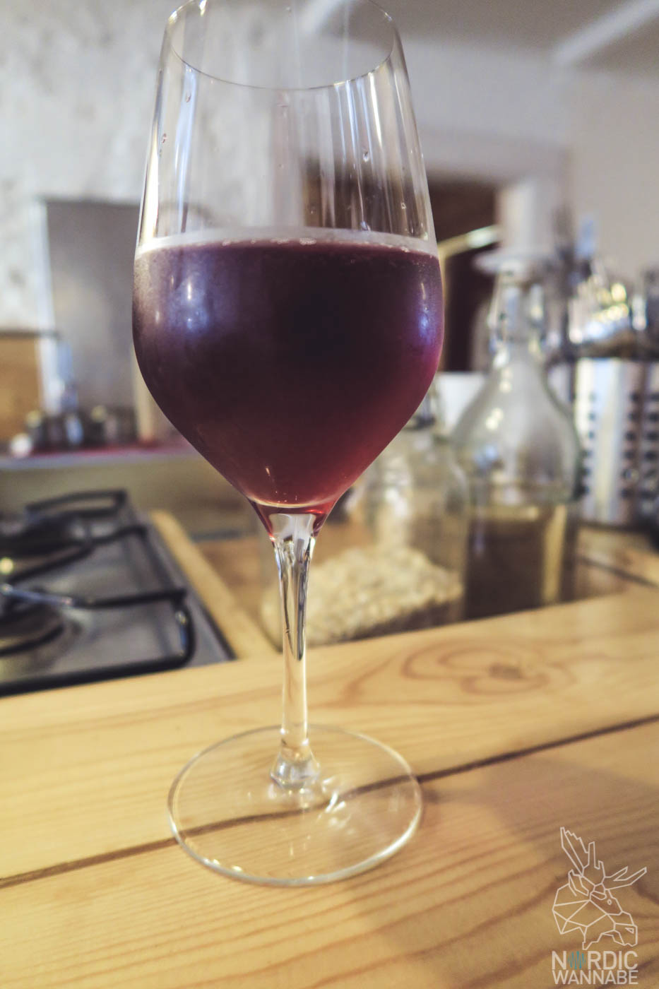 Die Einrichtung ist sehr minimalistisch nordisch. Viel weiß, viel Holz und wenig Schnickschnack. Zu trinken gab es einen fermentierten Blaubeer-Saft. Schon allein der Eingangsbereich ist mit dem Fell sehr hyggelig.