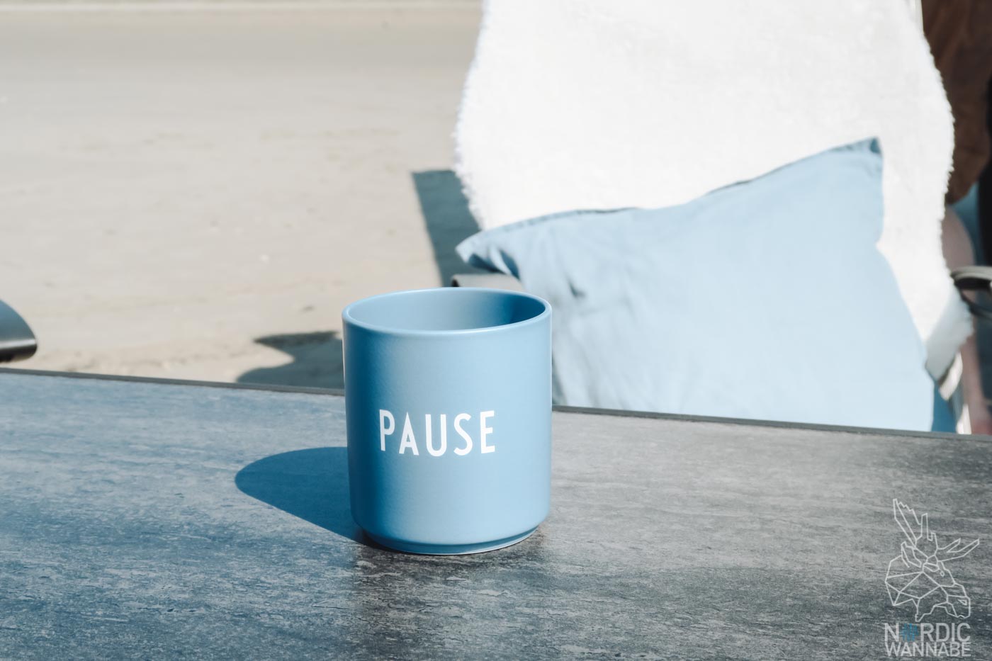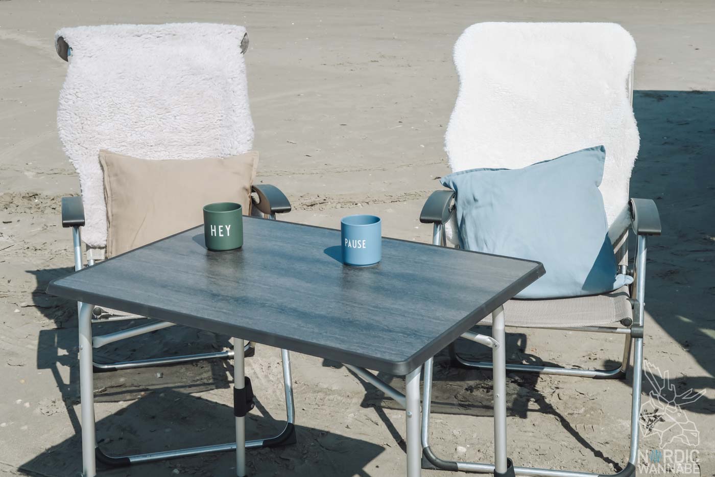 Sand, Meer, Muscheln,… Mit dem Auto oder Wohnmobil direkt bis ans Wasser? Das habe ich noch nie erlebt. Aber es war so schön. Das Wetter war perfekt, die Sonne schien, es war etwas windig und ich konnte wirklich mal die Seele baumeln lassen. Mehr Hygge geht nicht, oder? Und der Strand war so sauber. Ich hatte schon Befürchtungen, dass jeder seinen Müll dort liegen lässt, aber das war definitiv nicht der Fall. Sehr gut! Man sollte allerdings erfahrend sein beim Parken auf dem Sand, denn es kann passieren, dass man sich festfährt. Dazu aber später in einem Artikel mehr. Doch kommen wir zurück zur Hygge, dem dänischen Lebensgefühl. Schnell habe ich die Camping-Möbel aufgestellt, Kissen auf die Stühle, Fell-Imitate und meine Becher von Design-Letters mit „HEY*“ und „PAUSE*„. Diese dänischen Becher mit den bekannten Arne Jacobsen-Buchstaben könnt Ihr übrigens direkt bei NordicNest bestellen und meinen Blog unterstützen.