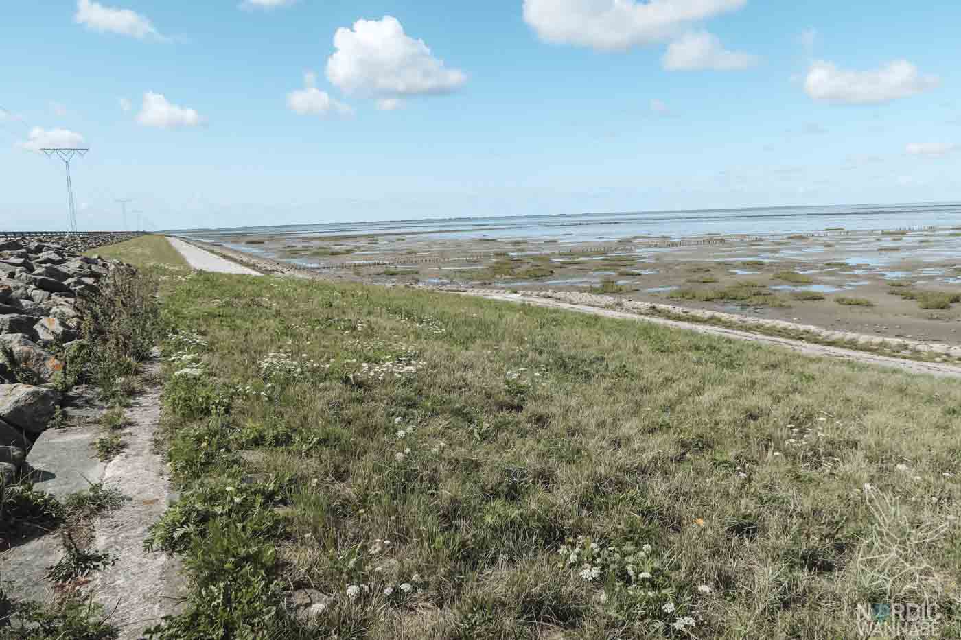 Okay, eine Insel. Toll! Meine Erwartungen waren nicht so hoch. Ich wollte eigentlich nur mal eben gucken, wie die Insel ausschaut und es war Liebe auf den ersten Blick. Meine Erwartungen wurden komplett übertroffen. Das Besondere an der Insel ist, dass man direkt mit dem Wohnmobil auf den Sandstrand fahren darf. Doch dazu später mehr. Die Kleien Insel liegt Drei Kilometer nördlich von Sylt. Sie ist also ein Katzensprung von Deutschland entfernt mit mit der Fähre direkt von Sylt aus erreichbar. Man kann aber auch, so wie ich, über den neun Kilometer langen Rømødæmningen (den künstlichen Rømø-Damm) anreisen. Der Ausblick ist hier schon sehr weitläufig. Das Wattenmeer reicht bis zum Horizont und auf dem Weg zur Insel könnt Ihr bei einem kleinen Parkplatz Pause machen und tolle Fotos machen.