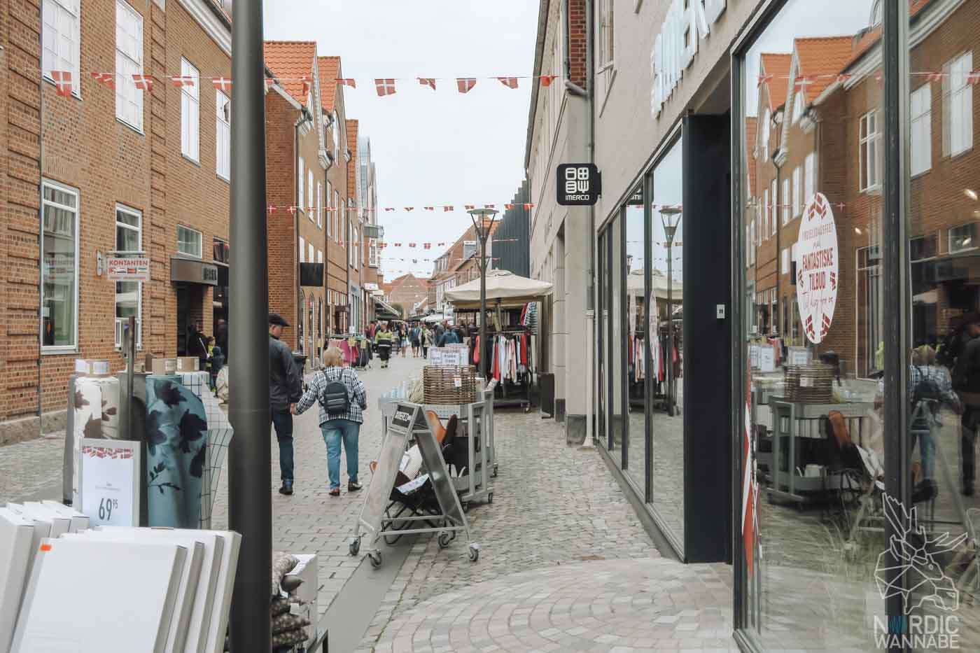 An der nächsten Ecke stand dann schon die nächste Versuchung: Ein Hotdog-Stand mit roten dänischen Würstchen. Auch in diesem Moment konnte ich nicht widerstehen. Wichtig: Der Hotdog-Mann nimmt nur Bargeld, aber direkt gegenüber war eine Bank. Auch das Hotdog, oder heisst es der Hotdog, war sehr lecker. Doch in Ringkøbing könnt Ihr nicht nur schlemmen, sondern auch schlendern. Die Fußgängerzone ist sehr schön. Es gibt Deko-Lädchen, einen Spielzeugladen, einen hyggeligen Tee-Laden und einen Shop mit Skandi-Tischkultur.