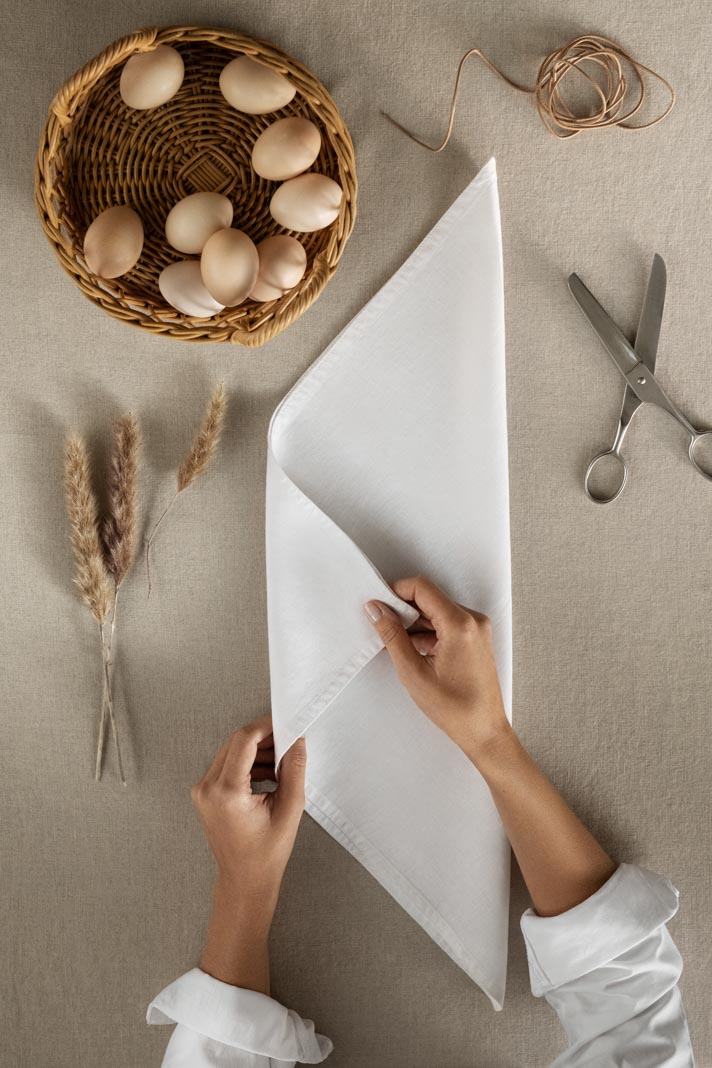 - Eine Stoffserviette von einer Ecke zur anderen falten.