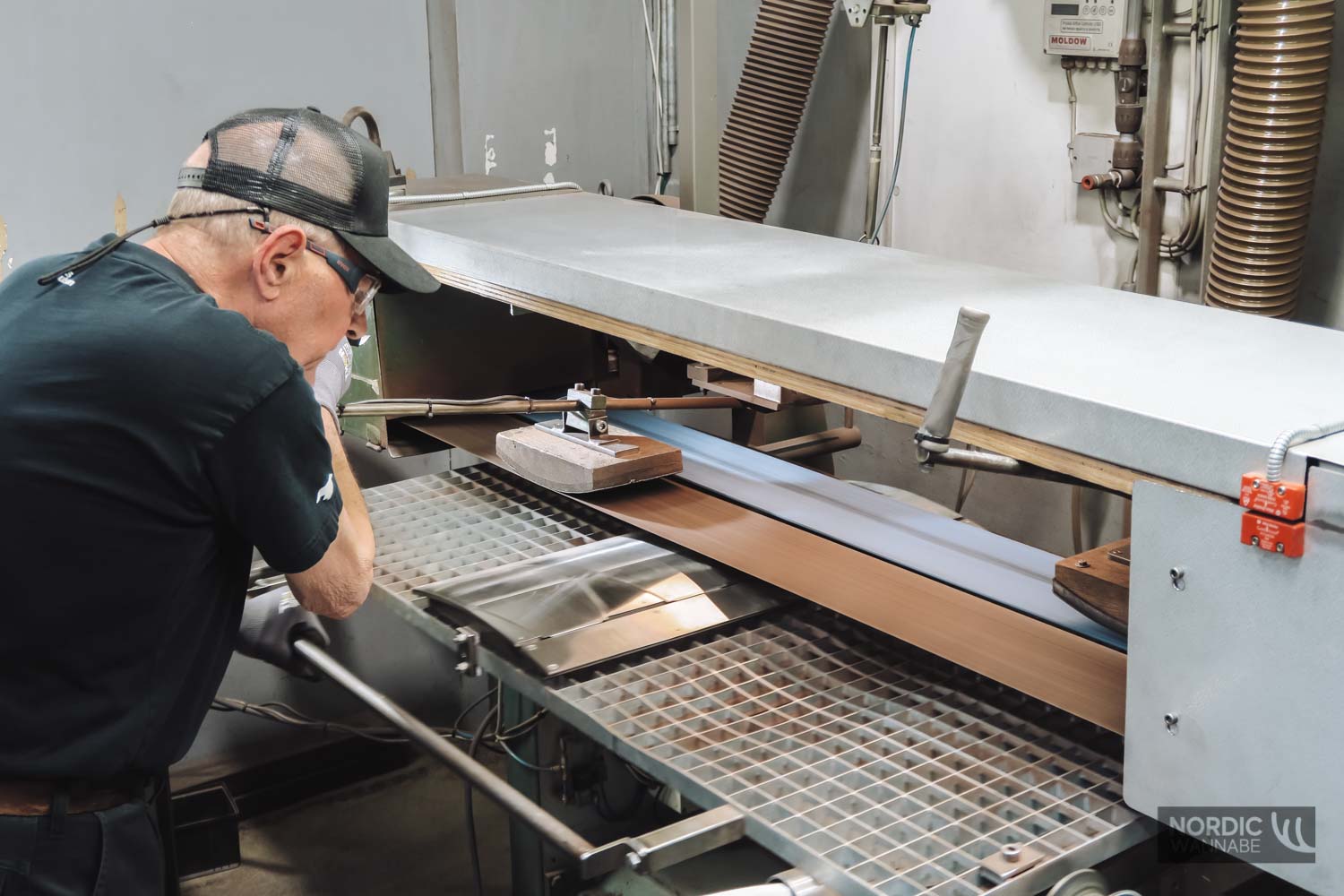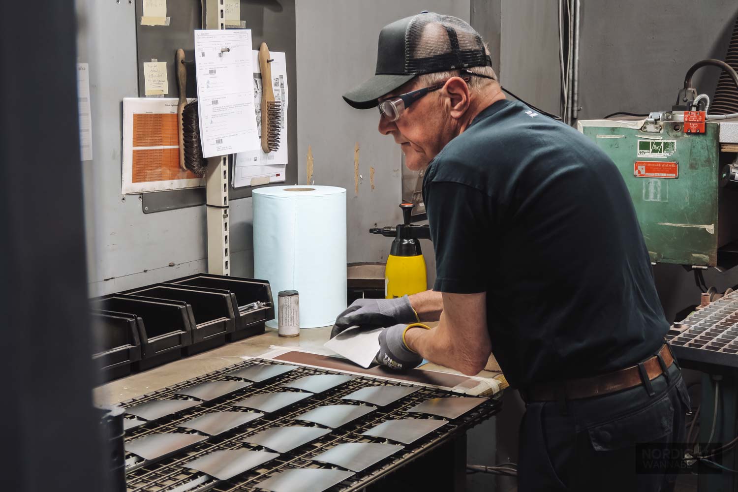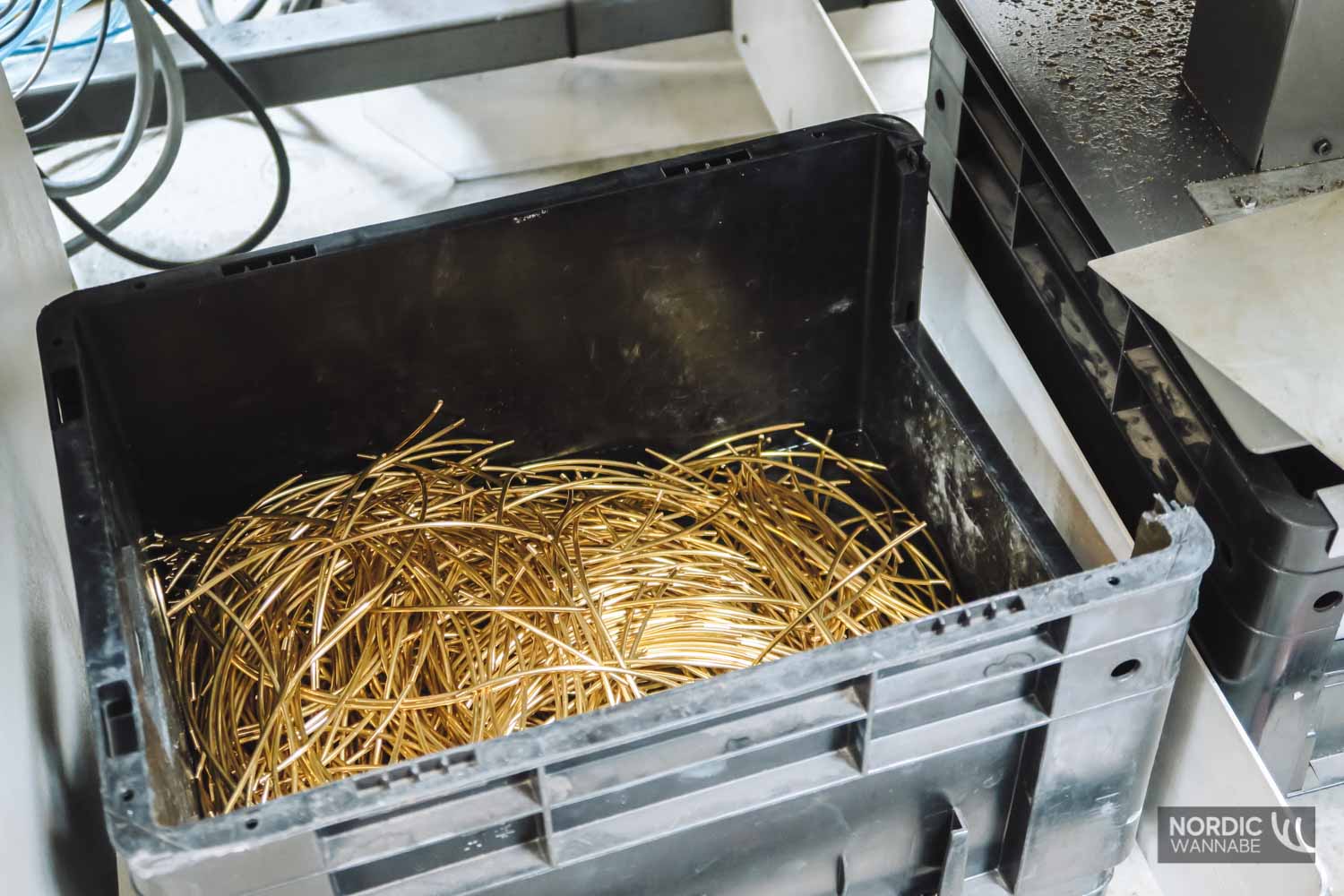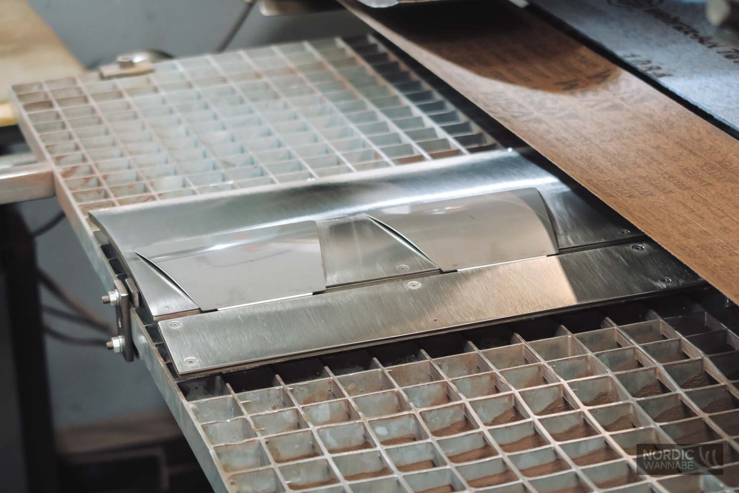 Bei meinem Rundgang bei Louis Poulsen wurde schnell klar: Alles beginnt mit Metall-Arbeiten. Und das nicht ohne Grund, denn die Leuchten sind solide, lassen sich dadurch von Generation zu Generation weitergeben und sind sehr langlebig. Es brummt, hämmert und zischt… wir gehen weiter. Große Regale stehen links und rechts des Weges mit einzelnen Komponenten. Diese werden in den Werkhallen in Form gebracht, geschliffen und poliert. Wie hier beispielsweise für die PH Artichoke. Jedes einzelne Blatt der 72 Blätter aus Edelstahl, Kupfer oder Messing wird von Hans, seit vielen Jahren gewissenhaft mit unterschiedlichen Schleifbändern zu Hochglanz gebracht.