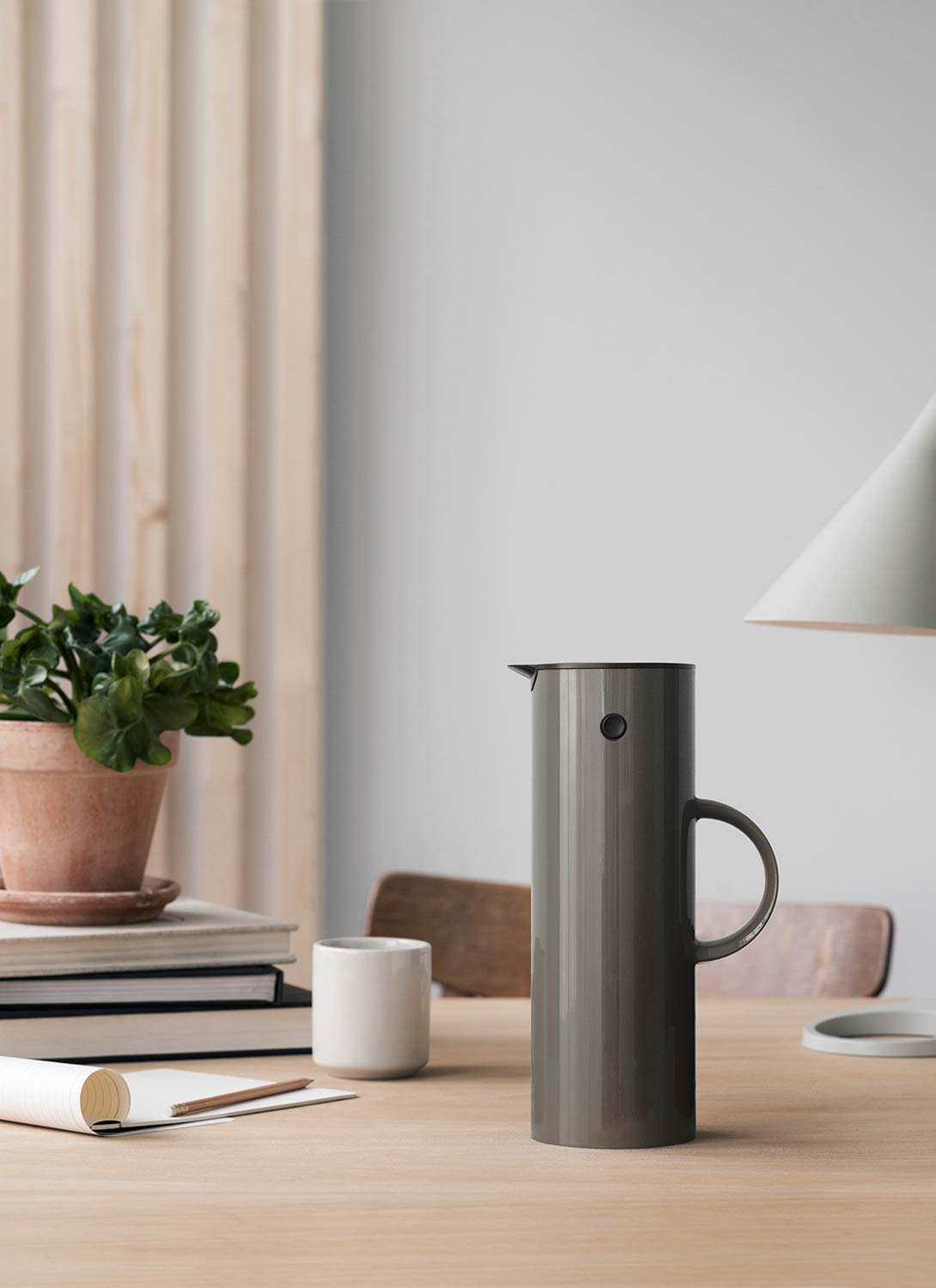 Die Geschichte hinter der ikonischen EM77 Isolierkanne und deren Entstehung ist, dass Stelton eine Thermokanne schaffen wollte, die zu der Cylinda-line-Serie passt, die Arne Jacobsen 10 Jahre zuvor entworfen hatte. Erik Magnussen wurde mit dieser Aufgabe betraut und entwarf eine Thermokanne, die über die gleiche zylindrische Form und den gleichen Materialausdruck wie die gefeierte Cylinda-Linie verfügt. Die Thermokanne wurde schnell zum Erfolg und ist seitdem weltweit zu einer begehrten Designikone geworden.