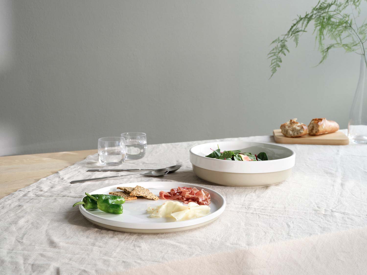 Man kann die großzügige Schale verwenden, um einen schönen Salat anzurichten oder sie mit Gemüse, kombiniert mit frischen Kräutern, in den Ofen schieben. Schon entsteht ein leckeres Gericht, das man direkt aus dem Ofen auf den Tisch servieren kann. Die Schale und die Servierplatte können auf bis zu 230 °C erhitzt werden. Die Servierplatte mit dem niedrigen Rand eignet sich perfekt zum Servieren von geschnittenem Fleisch, Fisch oder gegrilltem Gemüse – oder zur Präsentation eines Kuchens.