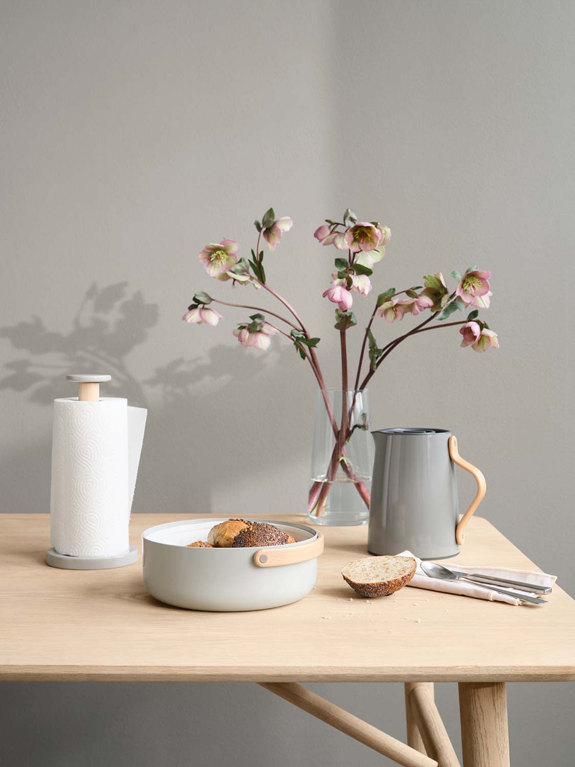 Die Emma-Kollektion, bekannt für seine klaren Linien und innovativen Materialkombinationen aus Stahl, Steinzeug und geformtem Buchenholz ist ein Designklassiker von Stelton. Eine Designphilosophie und Materialauswahl, die sich auf die dänische Designtradition der 1950er- Jahre bezieht. Die Emma-Serie besteht u. a. aus einem Wasserkocher, einem Toaster, einer Kaffee- und einer Teekanne, Tassen und Tellern – und jetzt auch aus einer Brotschale und einem Küchenrollenhalter, damit der gedeckte Tisch komplettiert werden kann.