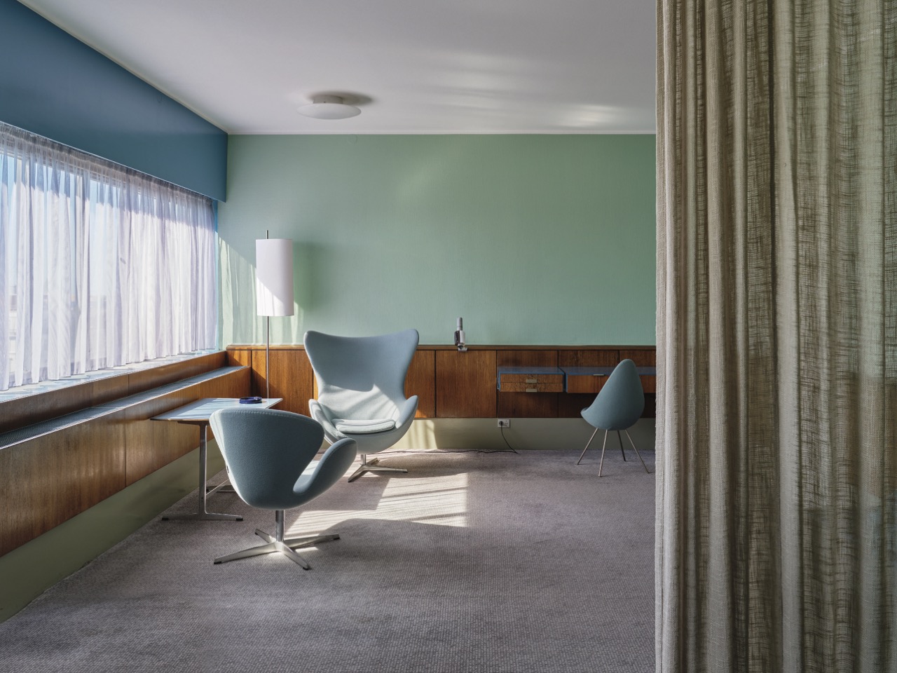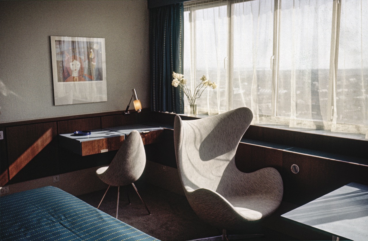 Auf der sechsten Etage des SAS Royal Hotels in Kopenhagen befindet sich das gut erhaltene Zimmer 606, das den Architekten und Designer Arne Jacobsen in seiner vollen Pracht zeigt. Dieser Raum ist der einzige erhaltene Innenraum, den Jacobsen für SAS entworfen hat. Das SAS Royal Hotel wurde 1960 fertiggestellt und diente sowohl als Luxushotel als auch als Flughafenterminal.