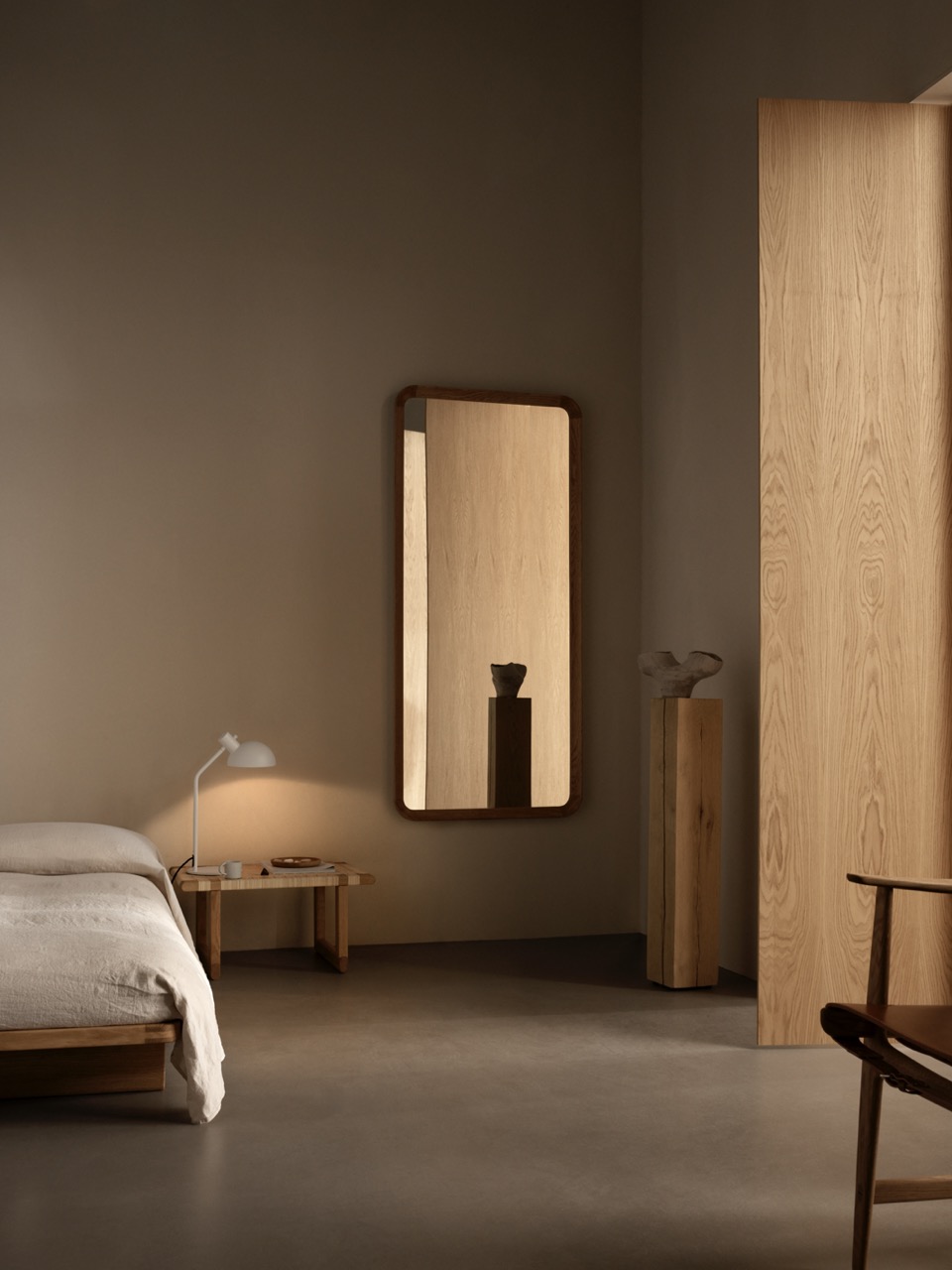 Der Radio House Spiegel ist mehr als nur ein Möbelstück; er ist ein künstlerisches Statement. Das massive Eichenholz, sorgfältig von Hand gefertigt und mit höchster Präzision zusammengefügt, verleiht ihm eine zeitlose Eleganz. Anne Møller Sørensen von Vilhelm Lauritzen Architects betont die einzigartige Ästhetik des Spiegels: „Der Radio House Spiegel ist ein Möbelstück für sich und viel mehr als nur ein flacher Gegenstand. Das organische Holzprofil und die wunderschöne Art und Weise, wie es das Spiegelbild einrahmt, wirken fast barock. Wir haben uns entschieden, den Spiegel in Eichenholz zu fertigen, um ihm einen modernen, nordischen Look zu verleihen.“