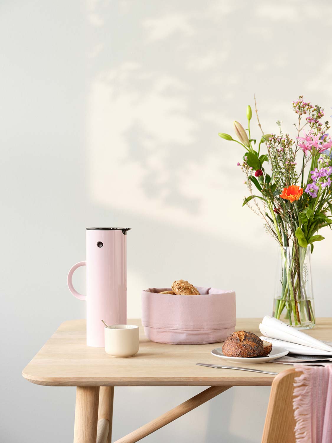 Die EM77 Isolierkanne von Erik Magnussen umfasst bis zu acht Tassen Kaffee und ist mit dem schlanken Design, der hohen Silhouette und dem genialen Kippdeckel heute noch so beliebt wie bei ihrer Einführung 1977.