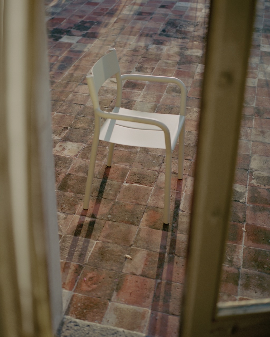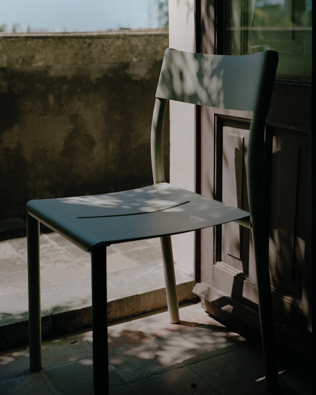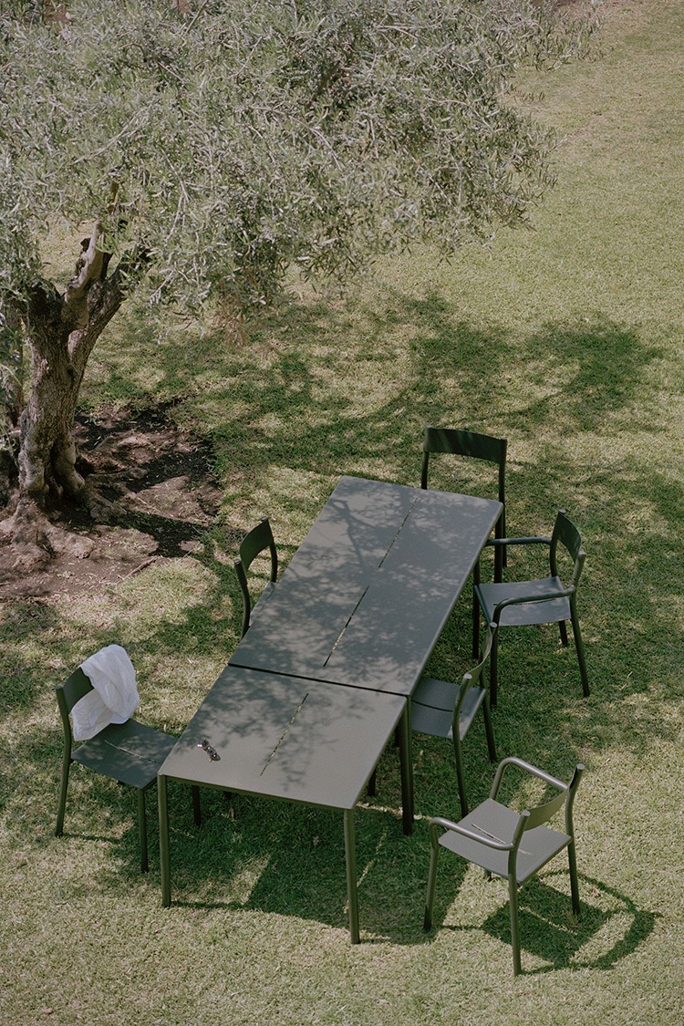 Die May-Outdoor-Kollektion besticht durch ihre schlichte, monochrome Erscheinung, die jedoch ohne technische Elemente auskommt. Der Stuhl zeigt, wie ein fein strukturiertes Sitzpolster auf einen kräftigen Rahmen trifft – zwei gegensätzliche Elemente, die harmonisch miteinander koexistieren. Das leichte Stahlblech umschließt den massiven Stahlrahmen eng und bildet einen starken und bequemen Sitz, der sanft den Körper umschmiegt. Eine Aussparung in der Sitzfläche ermöglicht den Wasserablauf und verleiht der ansonsten einheitlichen Oberfläche eine subtile Detail. In den Tischen wiederholt sich dieses Detail und bringt Leichtigkeit, Richtung und Einheit in die Familie.